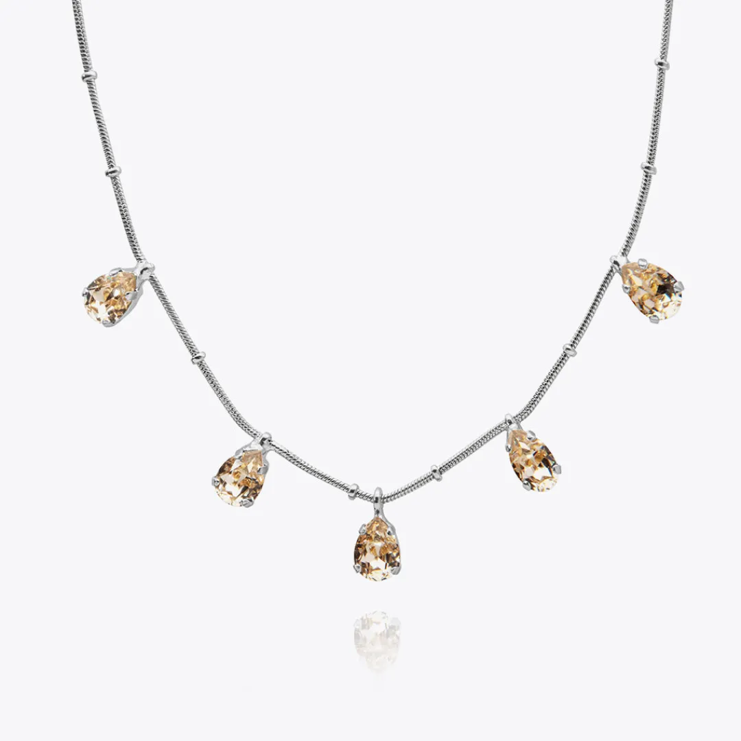 Our Estelle Necklace Gives You The Perfect Balance Between Simplicity And Charm. Featuring An Exclusive Chain With Five Hanging Crystals, This Necklace Exudes Playfulness With Subtle Hints Of Sophistication. Available In Crystal, Silk And Rainbow Combo.