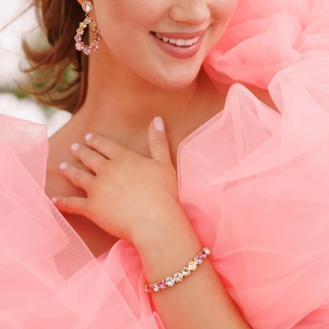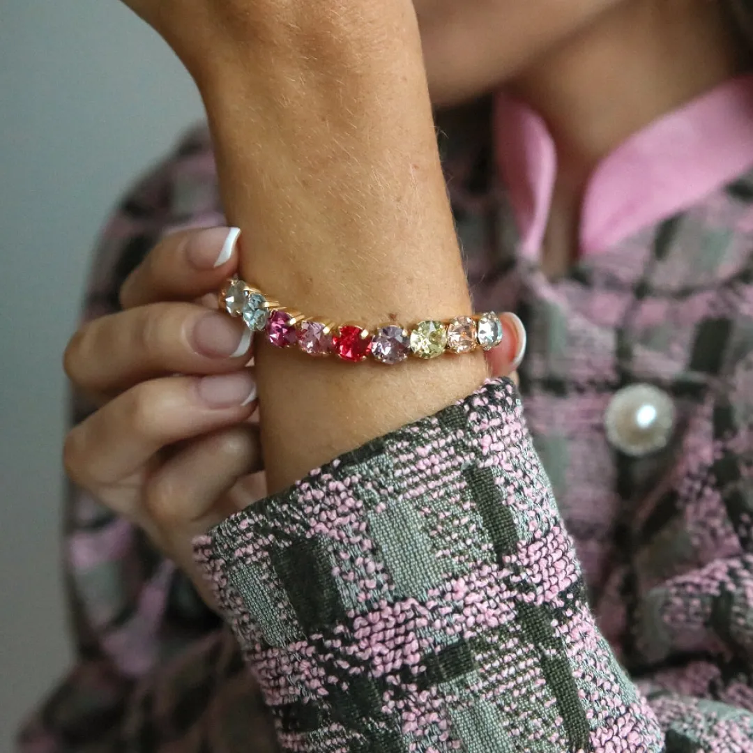 Our Best Selling Gia Stud Bracelet Is Now Launching In Pastel Rainbow Combo! Classic And Timeless, This Design Will Never Go Out Of Style. The Bracelet Is Made From 18K Gold- Or Rhodium Plated Brass And Set With Sparkling Quality Crystals That Catch The Light From Every Angle.