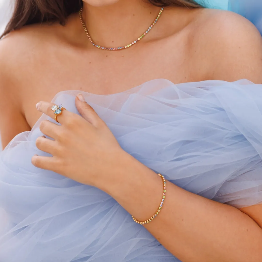 This Bracelet Will Take You From Day To Night Effortlessly. With Beautiful Small Stones In Colour This Piece Of Jewelry Will Sparkle Beautifully On Your Arm. The Siri Collection Comes In Earrings, Bracelets And Necklaces.