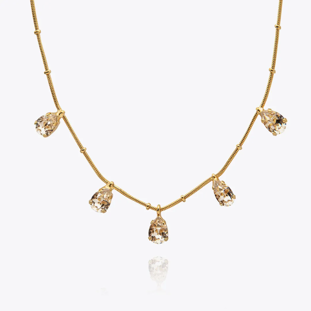 Our Estelle Necklace Gives You The Perfect Balance Between Simplicity And Charm. Featuring An Exclusive Chain With Five Hanging Crystals, This Necklace Exudes Playfulness With Subtle Hints Of Sophistication. Available In Crystal, Silk And Rainbow Combo.